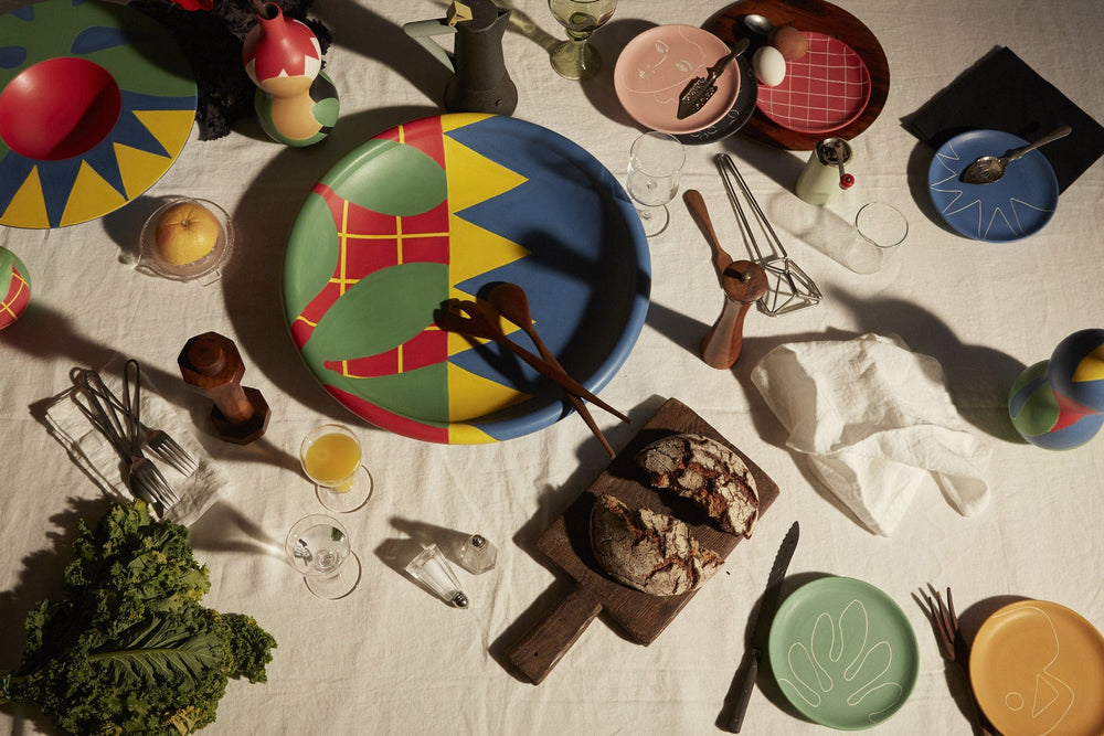 Among these are the philodendron leaf, the curves of a guitar or a woman's silhouette. The collection is composed of four serving dishes, three bottles, six plates and a pitcher that transpose the red, green or blue blocks from the original work into three dimensions.
