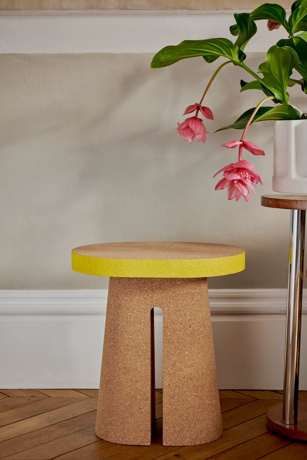 Le liège utilisé pour la fabrication des pièces Maison Matisse (tabouret, étagères, plateaux, accessoires de bureau) provient d’un mélange de d’écorces de chênes lièges et de chutes de lièges issues du recyclage de bouchons. Le liège est ensuite broyé et nettoyé afin d'obtenir un bloc de matière brute dans lequel chaque produit est taillé, afin d'obtenir une forme finale unique en son genre. La peinture est ensuite appliquée à la main, et les couleurs sélectionnées spécifiquement par Maison Matisse correspondent à la palette de couleur du tableau.