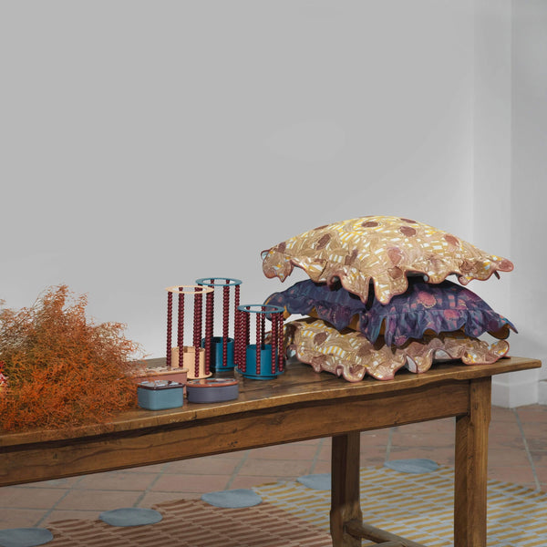 Dessiné par Cristina Celestino, le tissu du coussin Belle-épine s'inspire des compositions de fruits et légumes ainsi que des arabesques présentes dans le tableau Intérieur aux Aubergines (1911) d'Henri Matisse, considérée comme l'une des œuvres les plus décoratives du peintre.