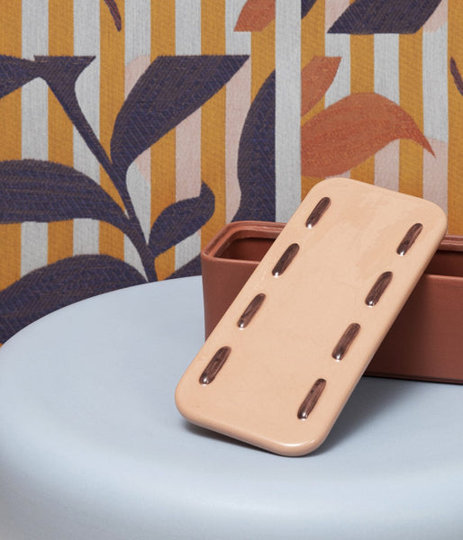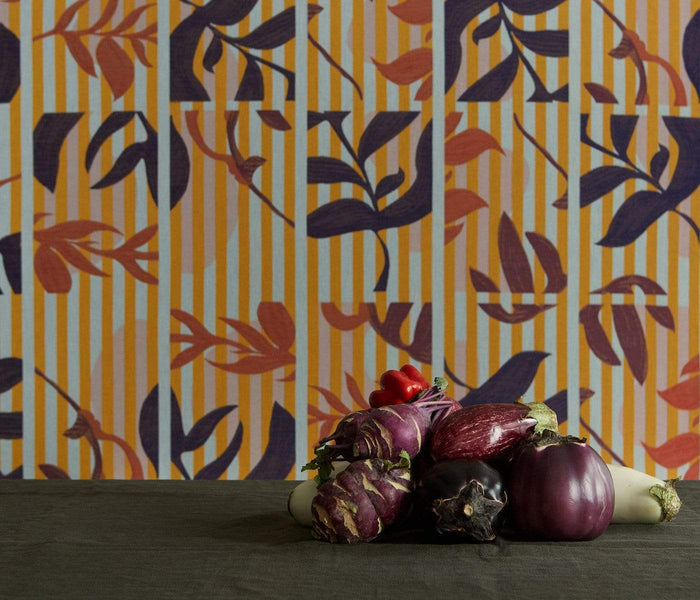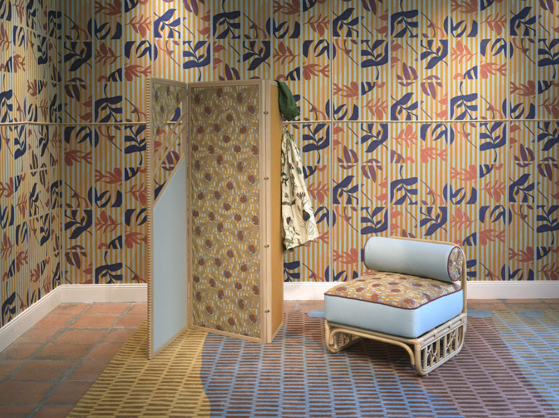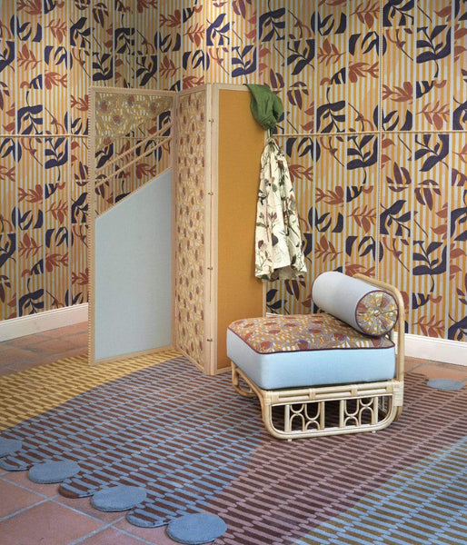 Réalisé en collaboration avec la designer italienne Cristina Celestino, le papier peint textile Été-indien présente des effets de texture qui confèrent à l'ensemble une impression de tridimensionnalité. Décliné ici dans des tons d'ocre, bleu et terracotta, il existe également dans une deuxième gamme de couleur.
