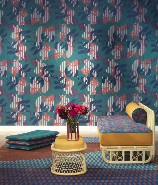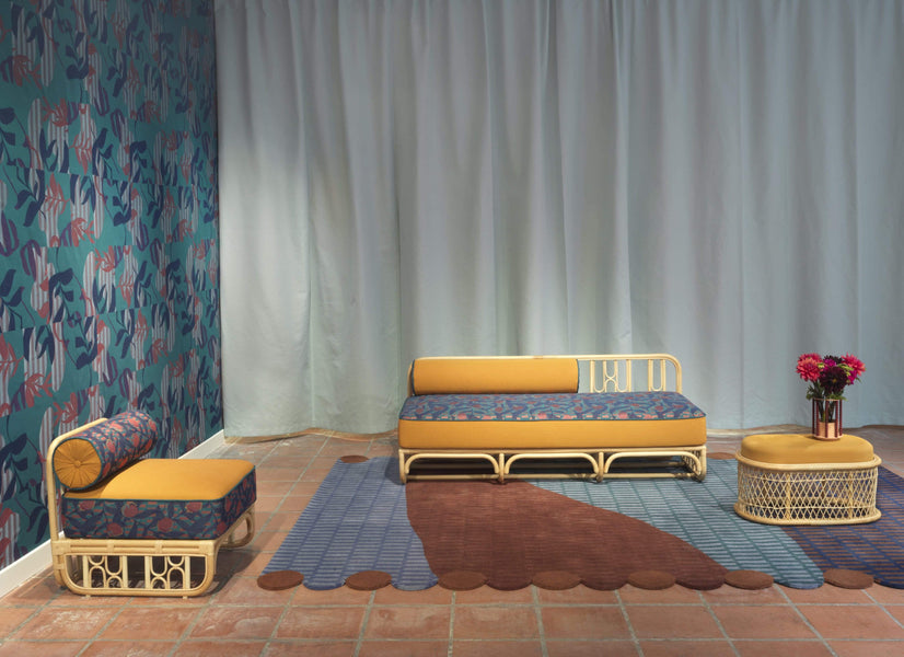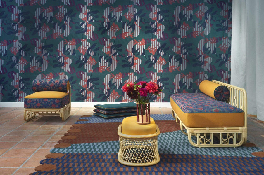 Réalisé en collaboration avec la designer italienne Cristina Celestino, le papier peint textile Été-indien présente des effets de texture qui confèrent à l'ensemble une impression de tridimensionnalité. Décliné ici dans des tons d'ocre, bleu et terracotta, il existe également dans une deuxième gamme de couleur.
