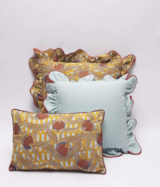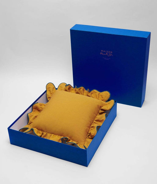 Quant à la confection en elle-même du coussin, elle a été confiée aux mains d'un artisan italien dont la technique et la précision ont permis, après de nombreux essais, de créer des volants identiques à ceux imaginés par Cristina Celestino. Enfin, un biais contrasté vient souligner cette finition.
