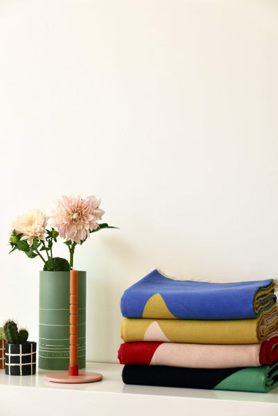 Le plaid Contrepoint, conçu par le studio Maison Matisse, se décline en quatre combinaisons de couleurs : vert/noir, rouge/rose, rose/ocre et bleu/ocre.